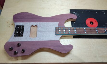 Le corps est donc en Aulne, en deux demi pièces contre collées, avec filets sur le pourtour, couleur crème pour la table d’harmonie et « tortoise » pour le dos.